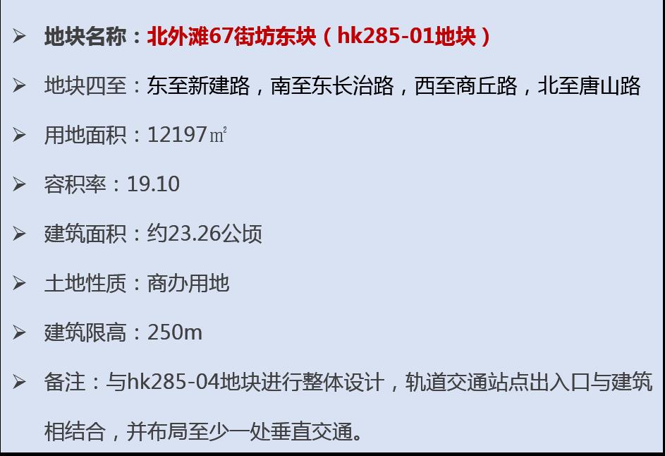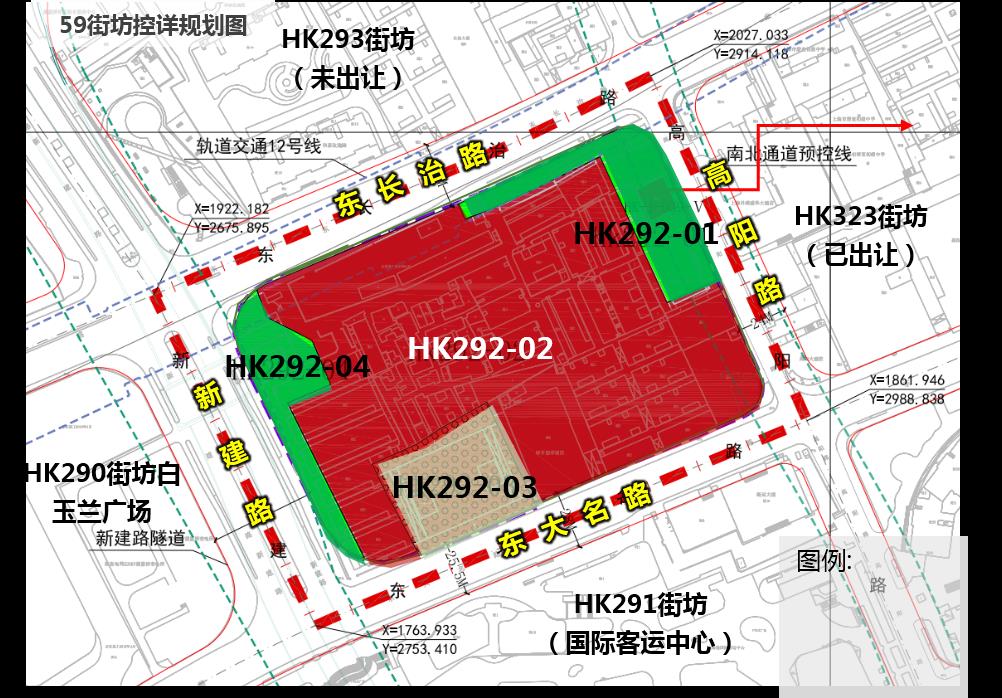 2022年2月24日,虹口区规划和自然资源局发布2022年工作计划,全力推进土地出让,围绕北外滩“三年出形象、五年出功能、十年基本建成的”总体目标,着力推进核心地段中央绿地周边地块出让工作,加快完成条件较成熟的59街坊、68街坊、67街坊(东块)、67街坊(西块)供地工作,其中北外滩67街坊东块临近轨交12号线国际客运中心站,拟规划建成两栋高度为200米和250米塔楼建筑,总建筑面积约23.26公顷。