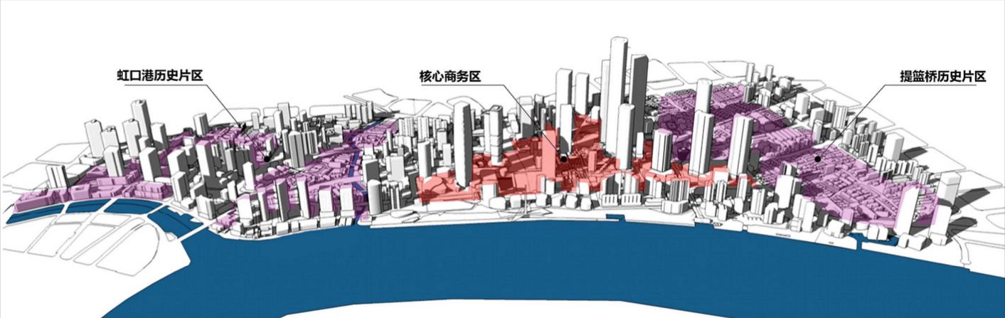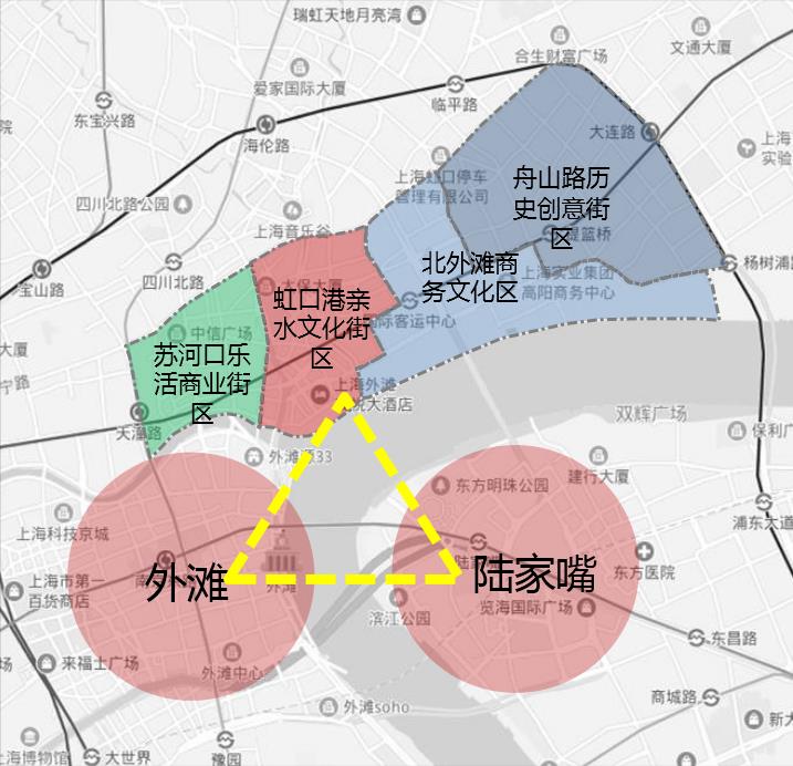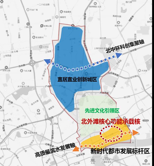 虹口区北外滩在总体格局规划上,中部核心商务区高强度、高密度开发,两侧提篮桥、虹口港历史片区低层高密度空间格局;全域构建出新 旧融合、以人为本的公共空间网络。同时根据虹口北外滩地区独特的海派文化底蕴和区域特点,打造四川北路海派时尚文化区、虹口港滨水生态 娱乐区、提篮桥创新生活体验区及以核心商务区为主的高端品质聚集区。
