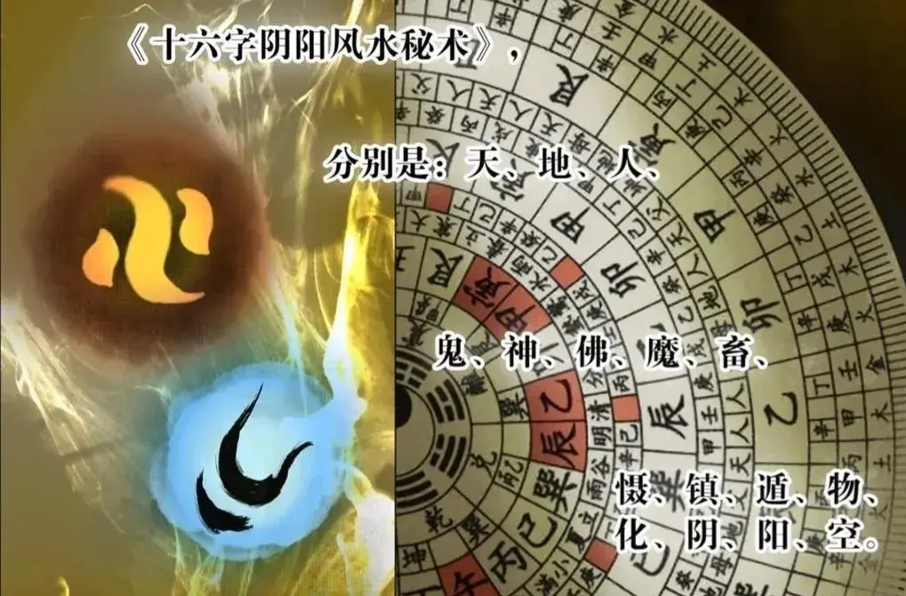 所谓的十六字,分别是天、地、人、鬼、神、佛、魔、畜、慑、镇、遁、物、化、阴、阳、空。这其中一半是阴阳,一半是风水,蕴含了无穷的变化之道。