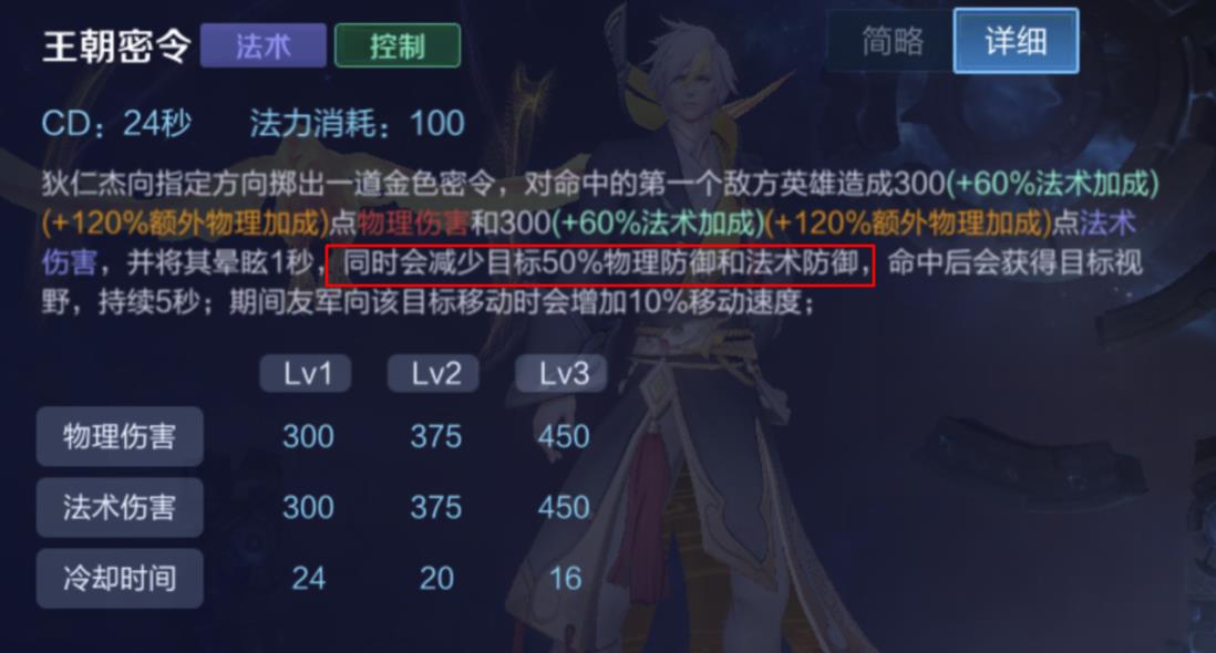 狄仁杰的大招在命中目标后会减少目标50%的物理防御和法术防御。