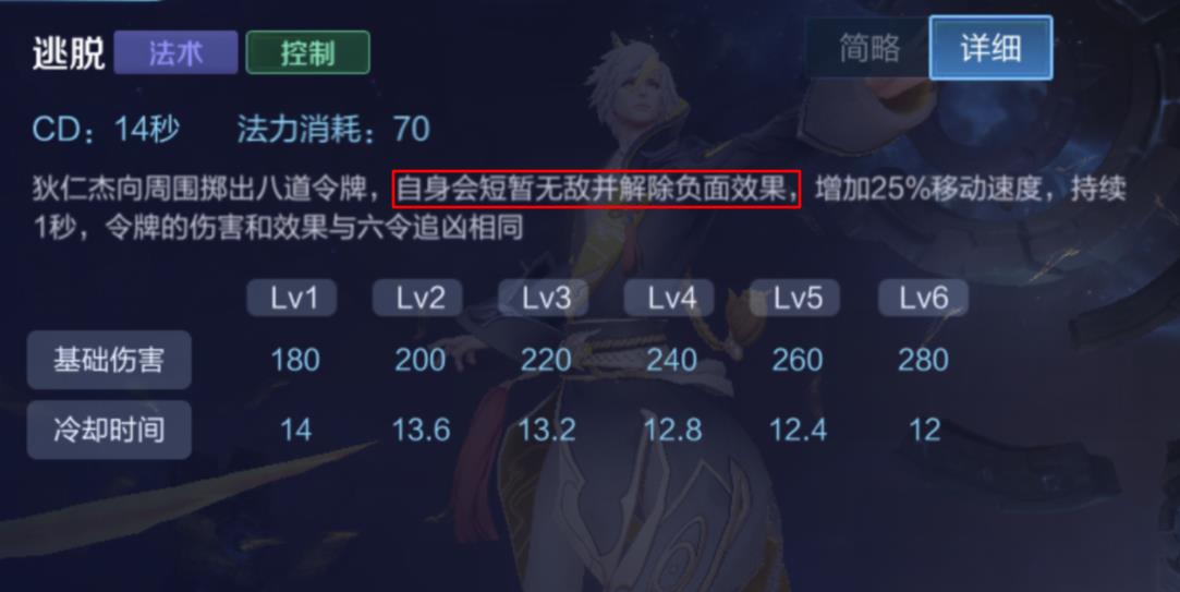 狄仁杰的二技能与召唤师技能净化的效果相同,可以短暂无敌并解除负面效果,这里的净化虽然没有说明短暂无敌,实际上也拥有这个效果,短暂的无敌效果在实战中非常考验对时机的把握,暂时不做讨论。