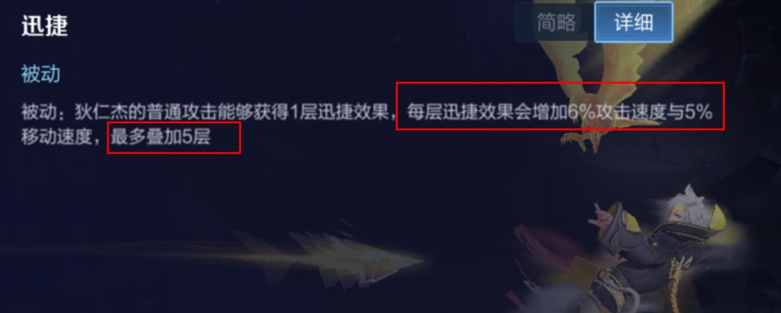 狄仁杰的每次普攻都会为其增加6%攻速和5%移速,最多叠加5层,即30%攻速和25%移速。