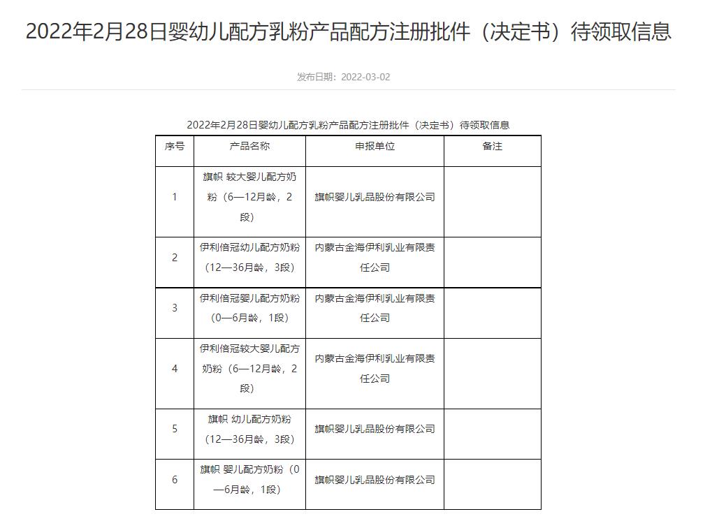 奶粉智库网讯,3月2日,国家市场监督管理总局食品审评中心发布婴配粉配方注册批件(决定书)邮寄详情单。信息显示,待领取信息涉及伊利金领冠旗下倍冠系列3款产品以及旗帜婴儿乳品旗下旗帜系列3款产品。这也让倍冠系列和旗帜系列成为首批符合我国奶粉新国标的婴幼儿配方奶粉。