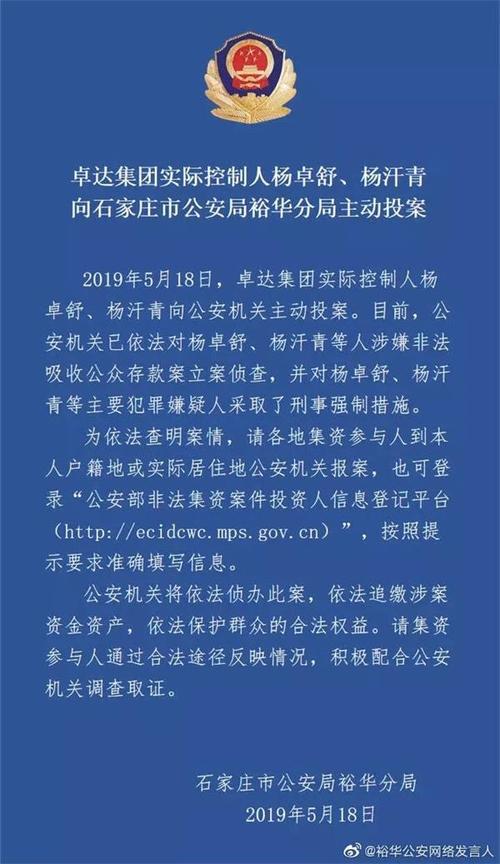 杨卓舒的资本帝国大厦已经摇摇欲坠,终于在2019年轰然坍塌,在各方压力下,杨卓舒被迫与儿子向公安机关自首。