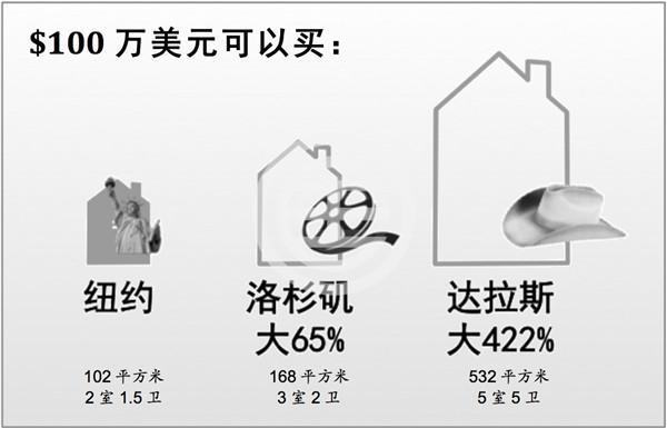 与纽约、波士顿、洛杉矶、旧金山等美国东西海岸大都市相比,达拉斯-沃斯堡生活费用更低,房屋性价比令人垂涎。如下表的最近数据显示,大约100万美元的预算,同样是在城市优质住宅区域,在纽约曼哈顿买到的是100平米建于上世纪二十年代的公寓,在洛杉矶能买到170平米,三室二卫的同样年代的独栋别墅,在达拉斯却能买到500多平米,占地近1500平米的五室五卫,新建成几年的豪华别墅。
