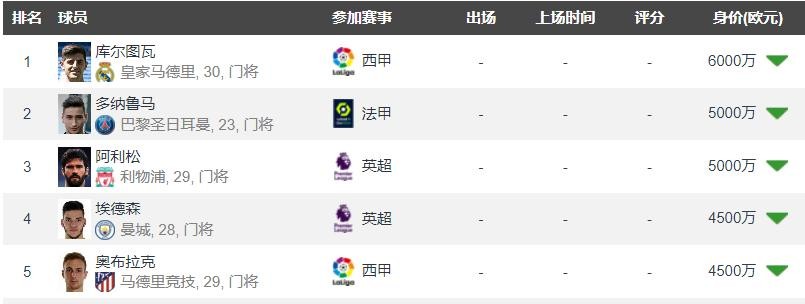 巴西人阿利松目前身价5,000万欧元,在世界足坛门将位置身价排行榜上排名第三。