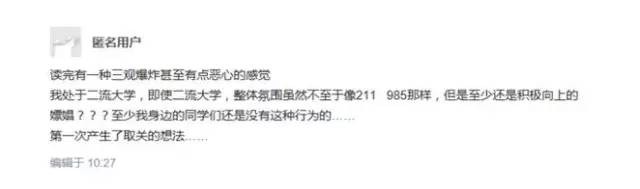 文章发布之后,这篇文章开始受到知乎、论坛等各大媒体正义的炮轰。有学生这样写道:“读完有一种三观爆炸甚至有点恶心的感觉。我处于二流大学,即使二流大学,整体氛围虽然不至于像211、985那样,但是至少还是积极向上的。嫖娼???至少我身边的同学们还是没有这种行为的……第一次产生了取关的想法……”