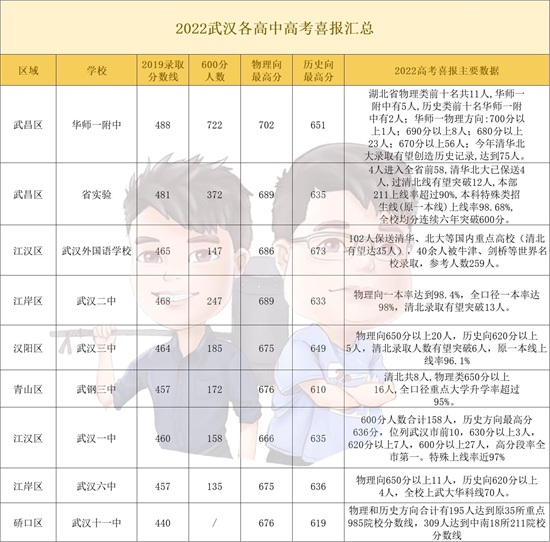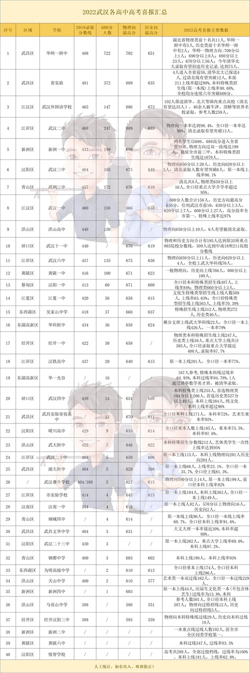 目前,武汉已有多所高中公布最新高考数据,部分学校数据来源于家长分享,如有出入,请以官方数据为准。下面,一起看看2022年武汉这40所高中高考情况!