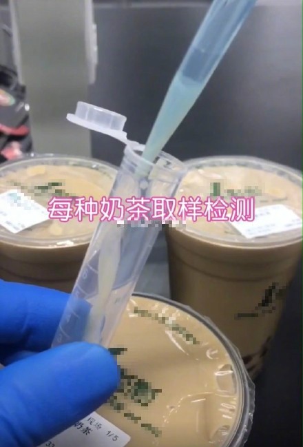 测试者将不同糖分的奶茶取同等毫升量,来进行取样检测。
