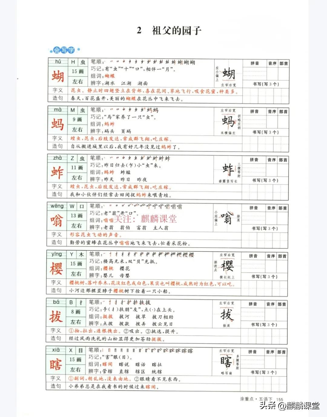 生字方面,“蝴”“蝶”是左右结构,注意虫字旁的写法;“蚱”字笔画较多,右边“乍”的笔顺要记清;“倭”字不要读错,是“wō”音。