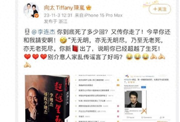 向太晒出多张截图写道:“@李连杰 你到底死了多少回?又传你走了!今早你还和我请安啊!无无明,亦无无明尽,乃至无老死,亦无老死尽。你新书出了,说明你已经超越了生死!别介意人家乱传谣言了好吗?”