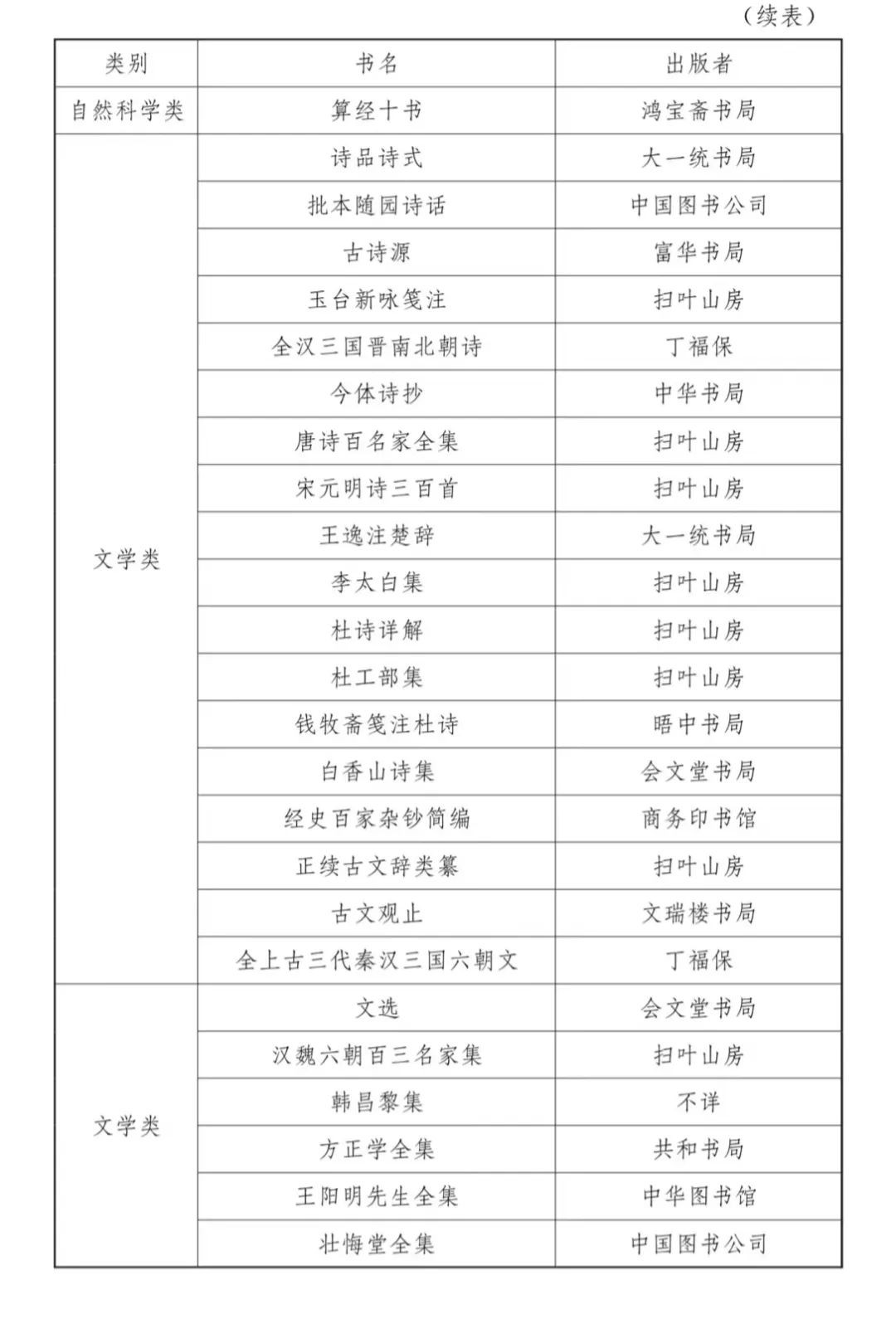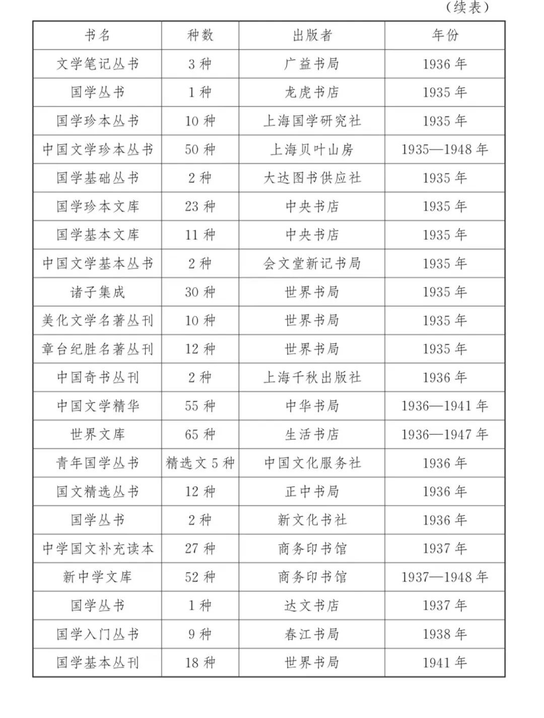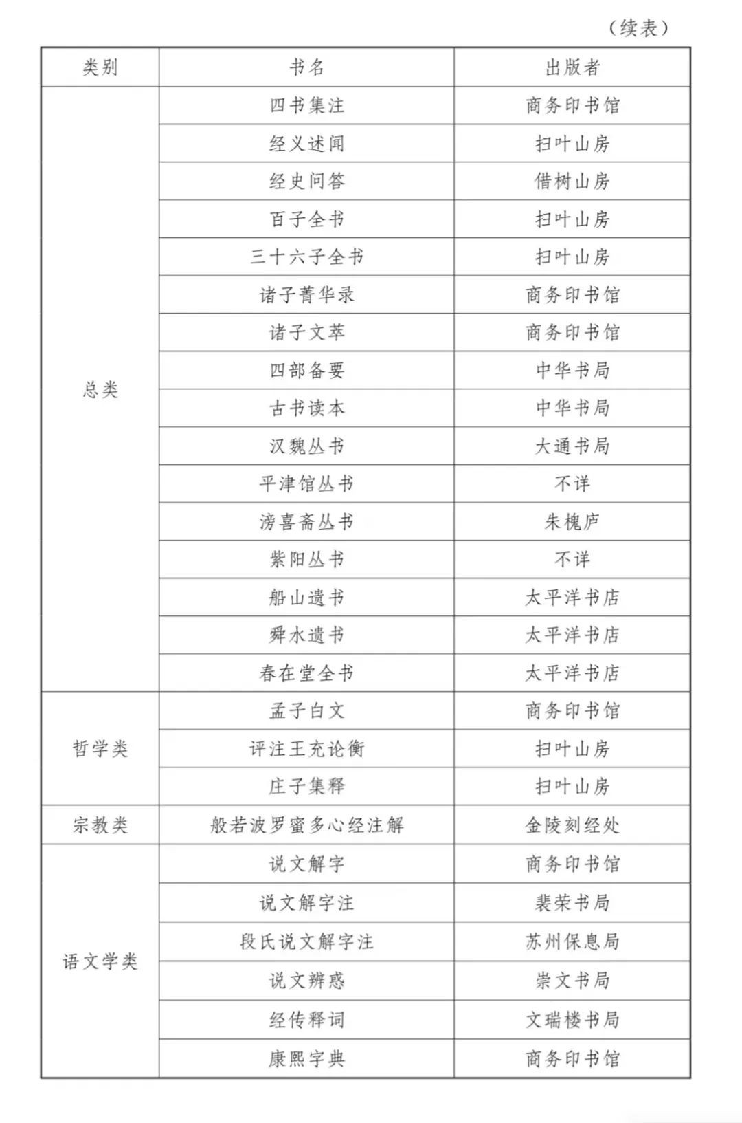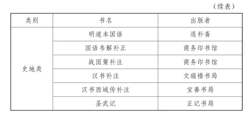 民国时期图书馆购藏的古籍包罗了诸多出版机构的图书。以浙江省立宁波中学图书馆为例,其购买的图书包括古籍丛书、中国文学等类别,整理方式有影印、排印,既有《万有文库第二集》、《四部备要》等丛书,也有《古书读本》等普及性选本,出版者有商务印书馆、中华书局、世界书局、大东书局等大型公司,也有历史悠久的扫叶山房,还包括亚东图书馆、太平洋书店等小型新书业代表。下文列表五统计各图书种类,以见浙江省立宁波中学图书馆购买古籍的细节,直观展示图书馆古籍的来源。