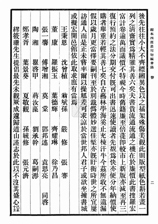 《四部丛刊》第一次预约定户中,有张季直先生、严又陵先生、叶揆初先生、徐 (世昌)总统、李孤帆先生、张菊生先生、蒋孟蘋先生、严范孙先生、黎 (元洪)总统、傅沅叔先生、陶兰泉先生、梁任公先生、陈叔通先生、周叔弢先生、恽铁樵先生、高梦旦先生、孙星如先生、守尾保太郎先生等 230户,团体定户24户,个人定户为206户。第二次定户中,有卢木斋先生、石滨纯太郎先生、桑田丰藏先生、胡子晋先生等119户,团体如图书馆等29户,个人90户。