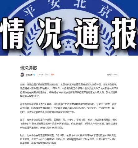 1、为“代购”商品往返北京和疫情严重国家,拘留!北京警方14日发布通报,王某国和于某为达到牟利目的,2月底从外地来京后,连续往返北京和疫情严重国家,为他人海外“代购”商品。按照疫情防控工作相关规定,目前正在对二人进行集中观察,待通过观察期后执行拘留十日的处罚。(平安北京微信公众号)