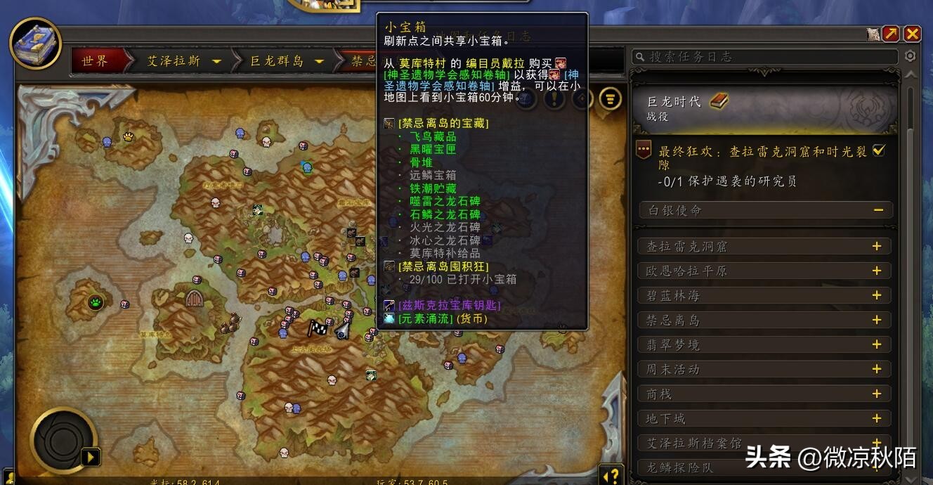 《魔兽世界》国服玩家其实已经等于错过“巨龙时代”这个资料片,如果是只喜欢打本的玩家,基本没影响,毕竟下个资料片又是重头开始。但对于喜欢收集和成就的玩家,回头去刷幻化、坐骑成就,那就是相当大的工作量。就那国服错过的“禁忌离岛”来说,和小岛相关的版本成就,主要就是开各种宝箱!