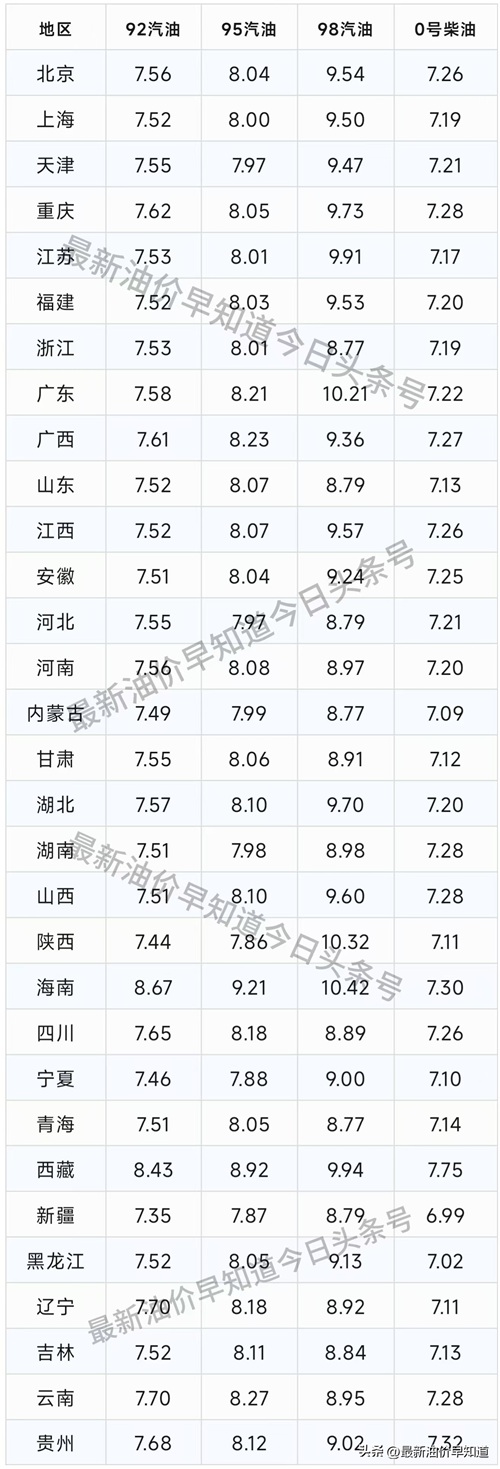 由于云南、陕西、四川、贵州、内蒙古、新疆、青海、西藏,黑龙江油价没有实行统一价格,这边列出的是省会城市的价格。