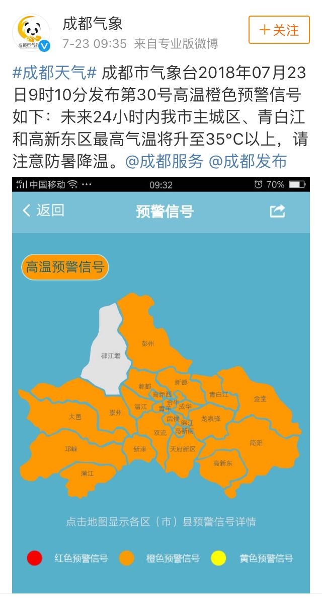 7月23日早晨9时10分,成都市气象台发布第30号高温橙色预警信号:未来24小时内成都主城区、青白江和高新东区最高气温将升至35℃以上,请注意防暑降温。