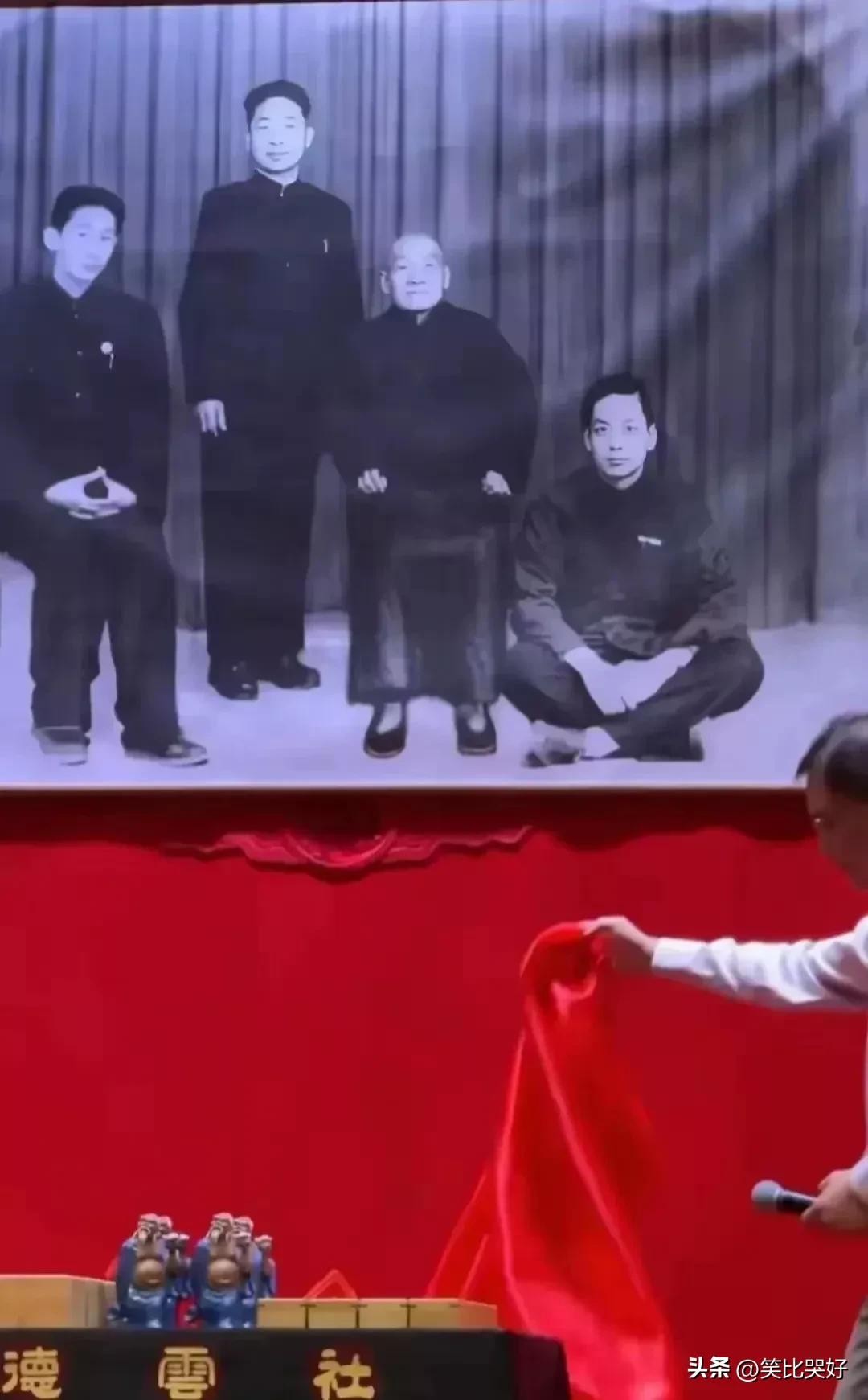 再看高峰收徒时挂的照片,在高峰收徒仪式开始之前,他为一张悬挂在舞台中央的合影揭幕。这是一张四代相声人的合影,分别是马三立、班德贵、周德山、范振钰。挂出这样四位前辈照片本来是理所应当,没有什么可议论的。因为这四位是和高峰一脉相传的。周德山是马三立的师父,马三立是班德贵的师父,班德贵是范振钰的师父,范振钰是高峰的师父。