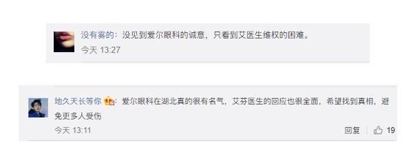 有网友表示,没见到爱尔眼科的诚意,只看到艾医生维权的困难。还有网友称,爱尔眼科在湖北真的很有名气,艾芬医生的回应也很全面,希望找到真相,避免更多人受伤。