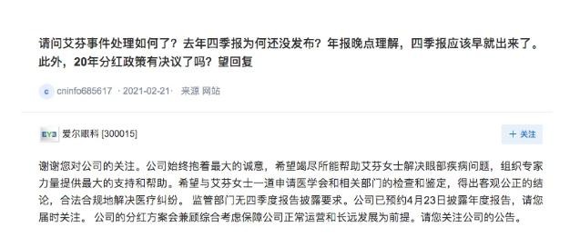 2月22日下午,上市公司爱尔眼科在互动平台上就武汉抗疫医生艾芬术后几近失明事件作出最新回应称,公司始终抱着最大的诚意,希望竭尽所能帮助艾芬女士解决眼部疾病问题,组织专家力量提供最大的支持和帮助。希望与艾芬女士一道申请医学会和相关部门的检查和鉴定,得出客观公正的结论,合法合规地解决医疗纠纷。