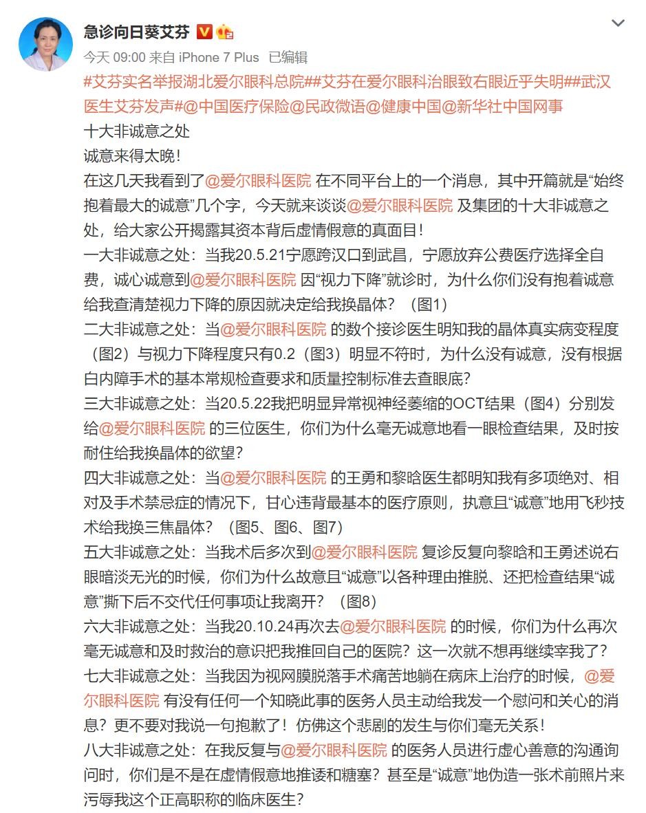 在最新一文中,艾芬质疑了爱尔眼科的“十大非诚意之处”。艾芬提出,当爱尔眼科医院的数个接诊医生明知患者晶体真实病变程度与视力下降程度只有0.2明显不符时,没有根据白内障手术的基本常规检查要求和质量控制标准检查眼底;当爱尔眼科医院医生都明知其有多项绝对、相对及手术禁忌症的情况下,违背最基本的医疗原则,执意用飞秒技术为其换三焦晶体;当其希望在武汉市卫健委的协调下,从爱尔眼科医院拿到完整手术录像视频、检查结果、晶体的进口报关单等资料时,爱尔眼科医院没有提供相关资料。