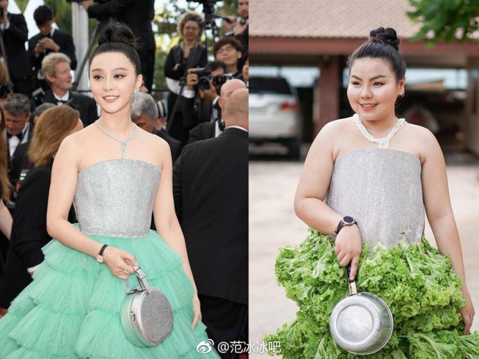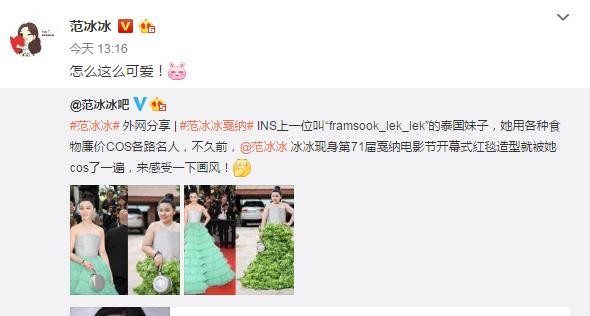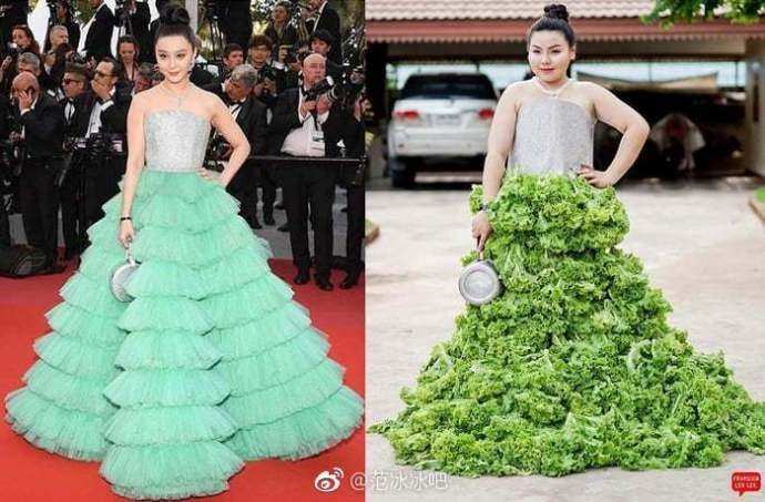INS上一位叫“framsook_lek_lek”的泰国妹子,她用各种食物廉价COS各路名人,不久前,范冰冰 现身第71届戛纳电影节开幕式红毯造型就被她cos了一遍,来感受一下画风!