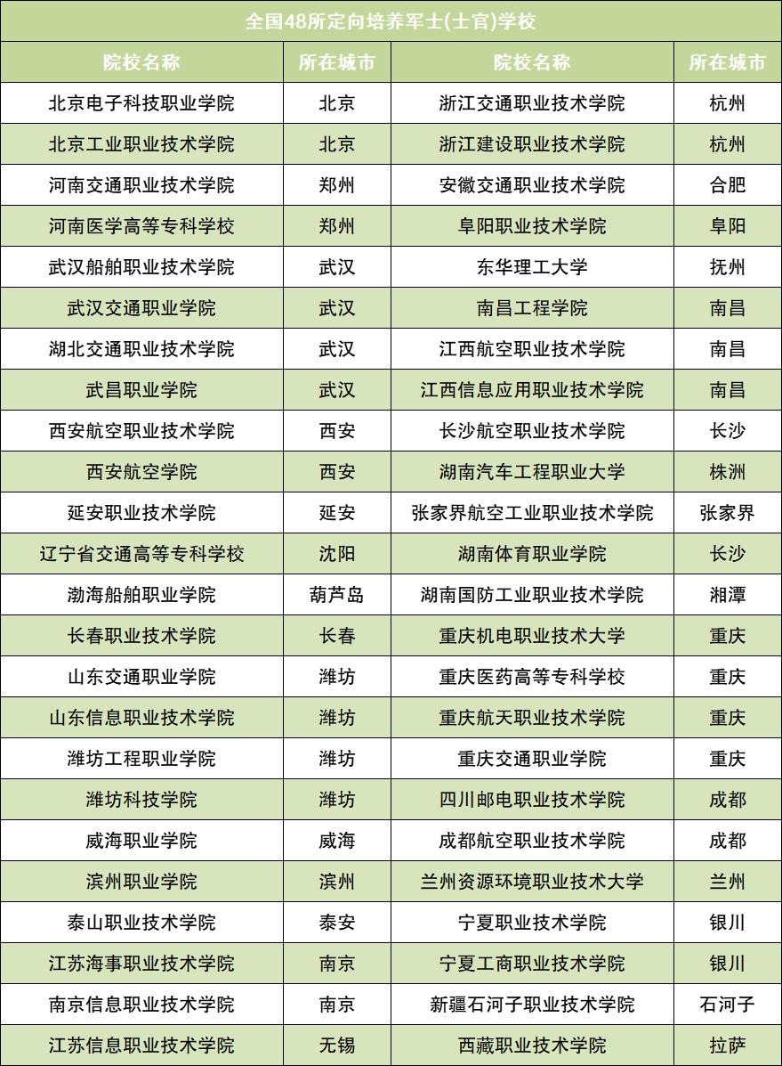 其中定向士官院校因为性质特殊,主要面向专科生招录,招生院校共计48所,包含武汉船舶职业技术学院、武汉交通职业学院、江苏海事职业技术学院等。