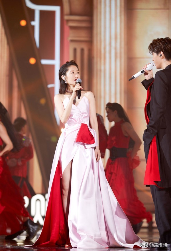 腰间系着的红色腰带和范丞丞的红色衣领完美呼应,让两人看起来更有CP感,裙摆还有开叉设计,美腿若隐若现。这种拖地的大裙摆,最适合和开叉元素结合了,既有高贵女神范,又不会压个显沉闷。刘敏涛的粉色礼裙面料也很nice,是丝滑的绸缎面料,让粉色看起来甜美不甜腻,带着满满的高级感。