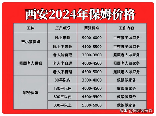 序言:在西安找个保姆到底要花多少钱?相信很多家里想请保姆的人都想知道这个答案,实际上保姆的工作内容、工作量不同、保姆的工资标准也不同,今天我就把西安2024年保姆价格做一个详细说明,以后家里找保姆时可以以这个作为参考: