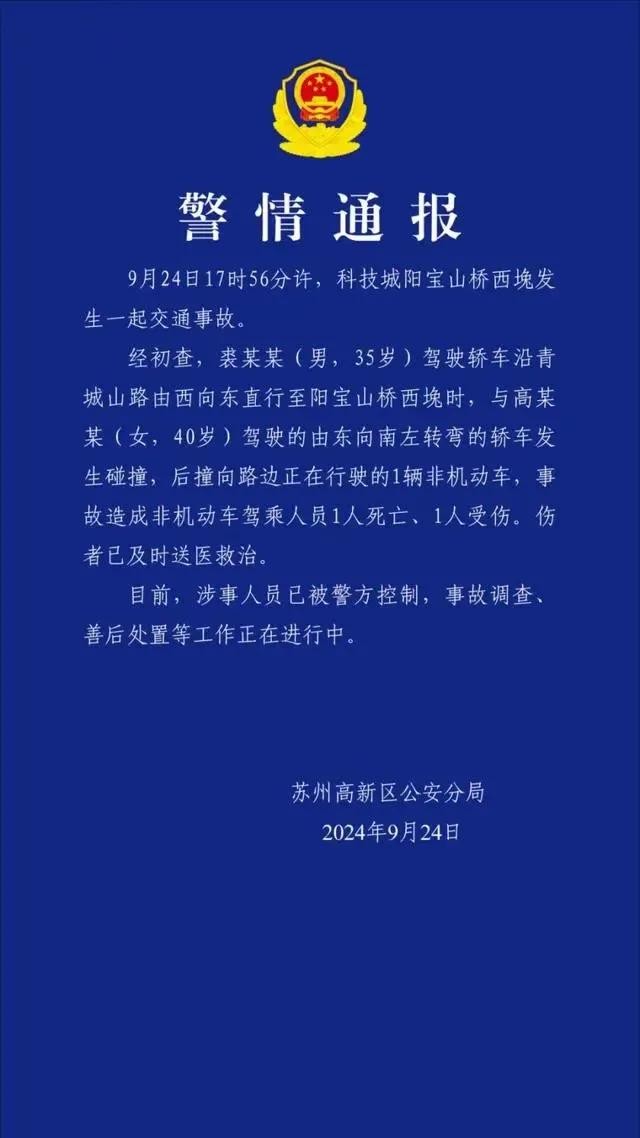 #苏州2车相撞后撞向非机动车1死1伤##苏州头条#