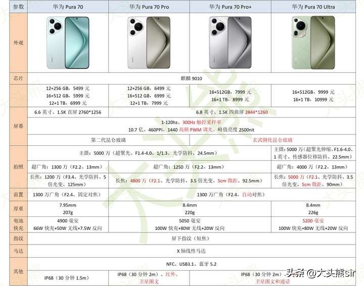 华为Pura 70、Pura 70 Pro系列详细参数配置分析,对比后优缺点明显