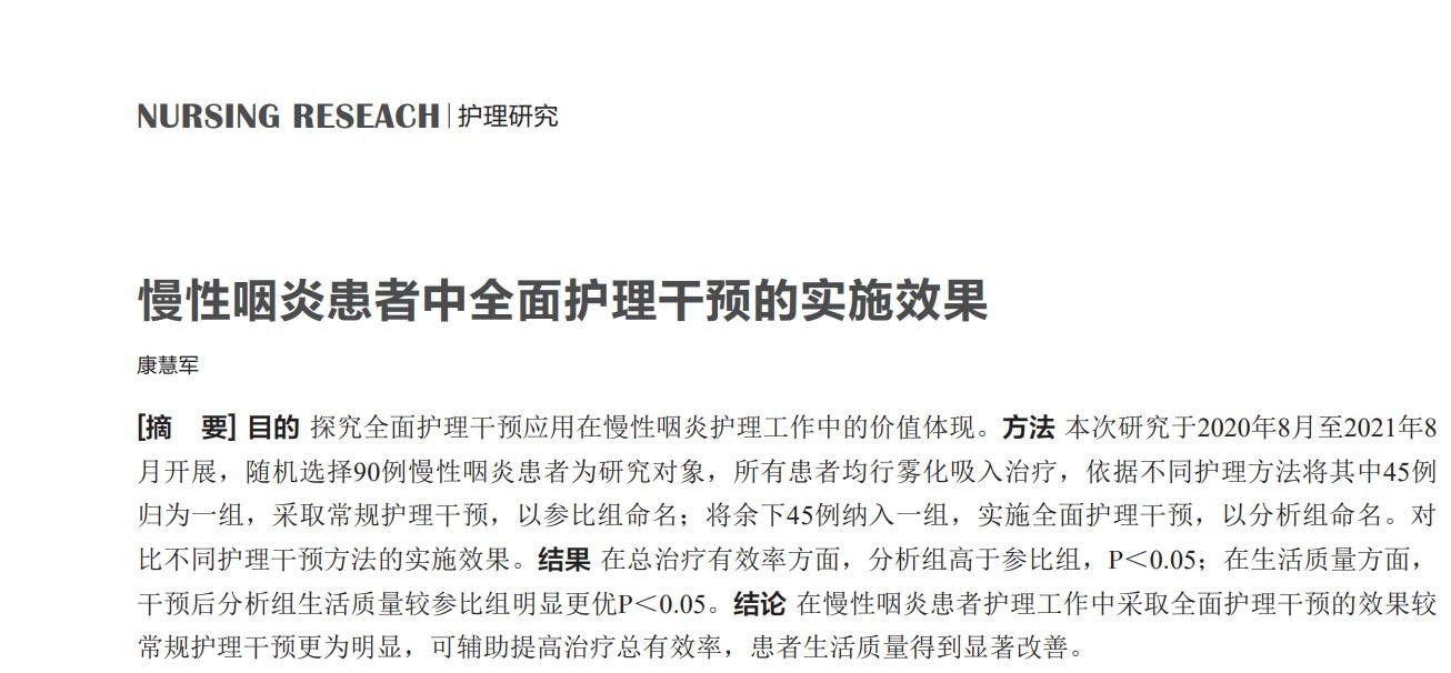 [1]康慧军.慢性咽炎患者中全面护理干预的实施效果[J].中国医学文摘(耳鼻咽喉科学),2023,38(06)