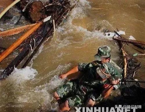 这是唐家山堰塞湖地段,两名战士冒着生命危险在紧急排障!