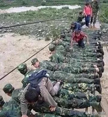 数十名官兵用身躯铺成“人桥”,让放学的孩子从自己的身上爬过。