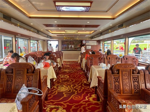 三星级游船客舱分为上下两层,一共坐了100多人,一排有三个座椅,古色古香的,每个人坐的都很舒服。我的座位位于二层靠过道的位置,上到二楼和三楼甲板上看风景很方便。船上还有免费WIFI和开水提供,无疑是一次舒服又享受的旅程。