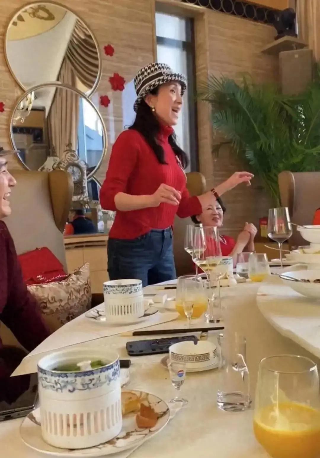她坐在酒桌前,与一众好友欢聚一堂,其中不乏王姬、冯雷等演艺圈的老面孔。
