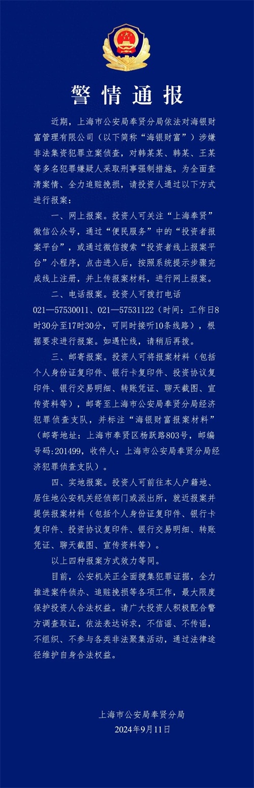 9月11日上午,上海市公安局奉贤分局对外发布,依法对海银财富管理有限公司涉嫌非法集资犯罪立案侦查,对韩某某、韩某、王某等多名犯罪嫌疑人采取刑事强制措施。目前公安机关正全面搜集犯罪证据,全力推进案件侦办、追赃挽损等各项工作,最大限度保护投资人权益。