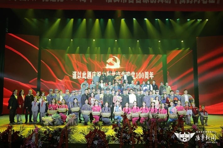 ▲ 观看专题演出,连队官兵代表、驻地官兵代表与全体演员合影留念