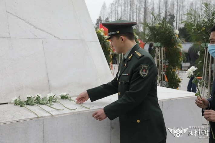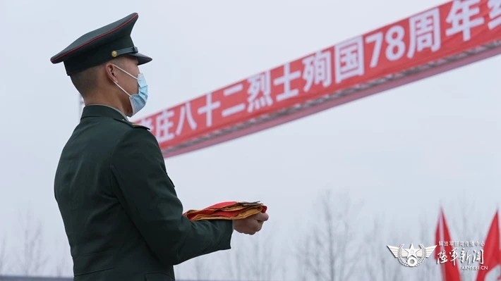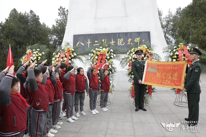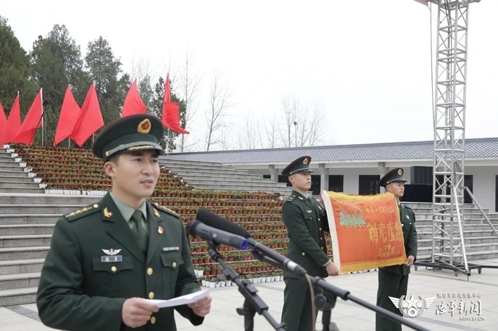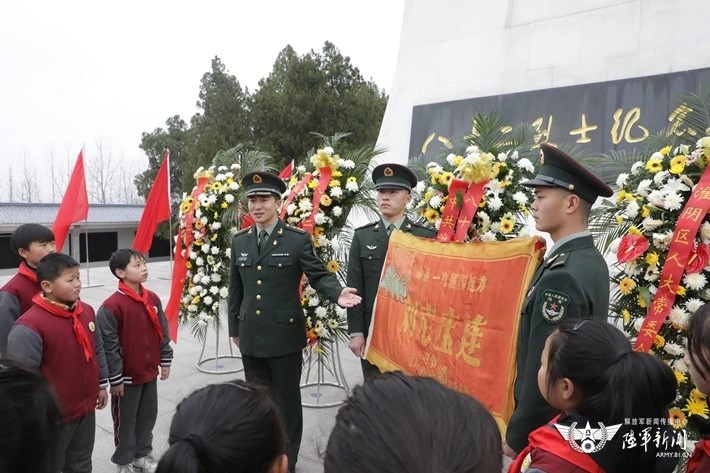 过程中,“刘老庄连”官兵与当地各界代表一同向八十二烈士纪念碑进献花圈,祭奠先烈。