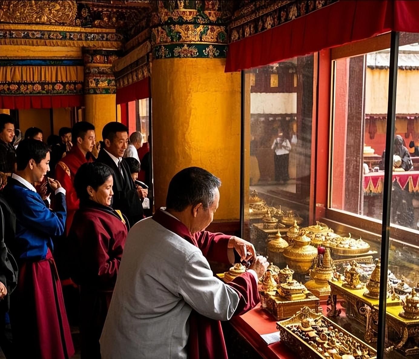 走进布达拉宫的红宫,马上就能感觉到特别庄重严肃的气氛。红宫里供着历代达赖喇嘛的灵塔,这些灵塔可都是宝贝中的宝贝。它们是用金、银、铜这些珍贵材料精心做的,表面上镶了好多亮闪闪的宝石,红宝石红得像血,蓝宝石蓝得像大海,绿松石透着神秘的光,珍珠、玛瑙这些也都相互照着亮。灵塔做得工艺特别好,每一个小地方都弄得特别好,不光是达赖喇嘛去世后休息的地方,更是藏传佛教信仰的中心,装着信徒们满满的敬仰和诚心的祝愿,是布达拉宫绝对的宝贝,不管时间怎么变,一直都闪着神圣的光。