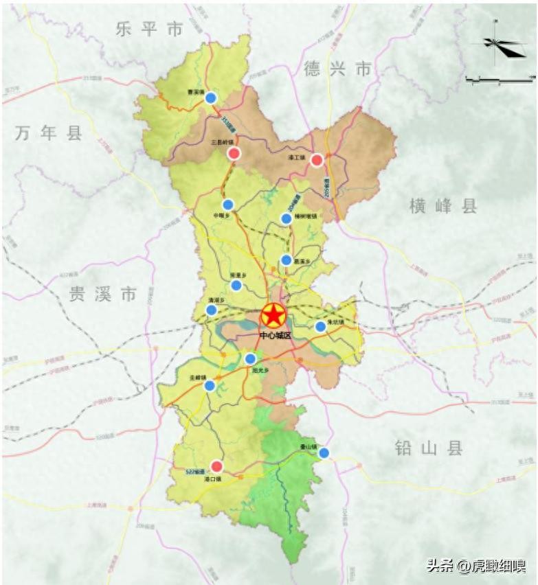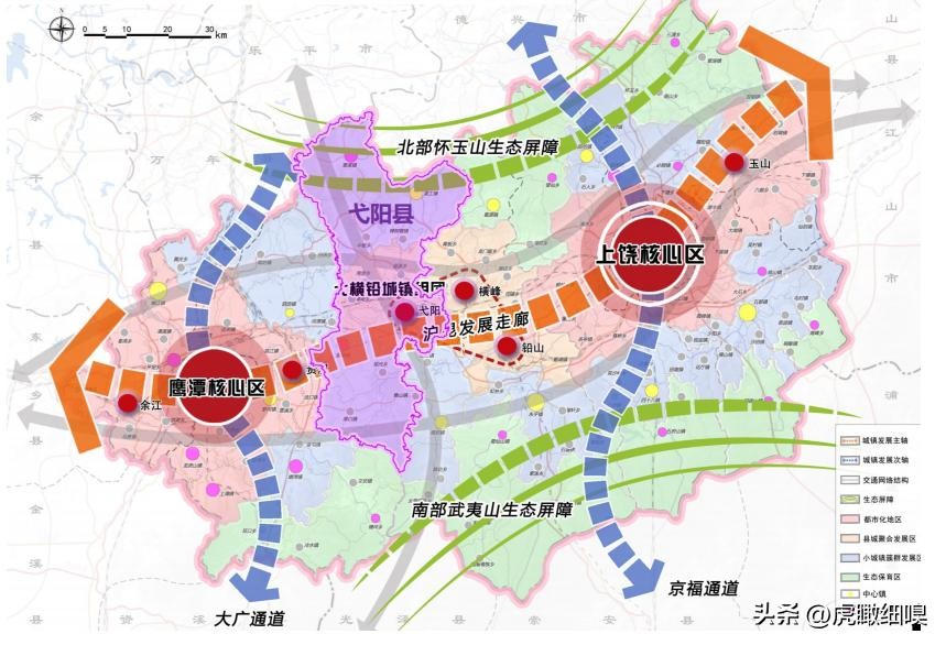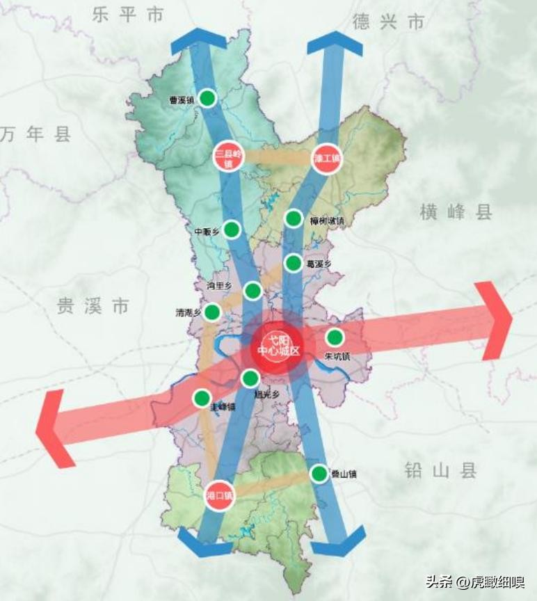 一核:弋阳中心城区;三心:漆工镇、三县岭镇、港口镇;多点:其他乡镇。