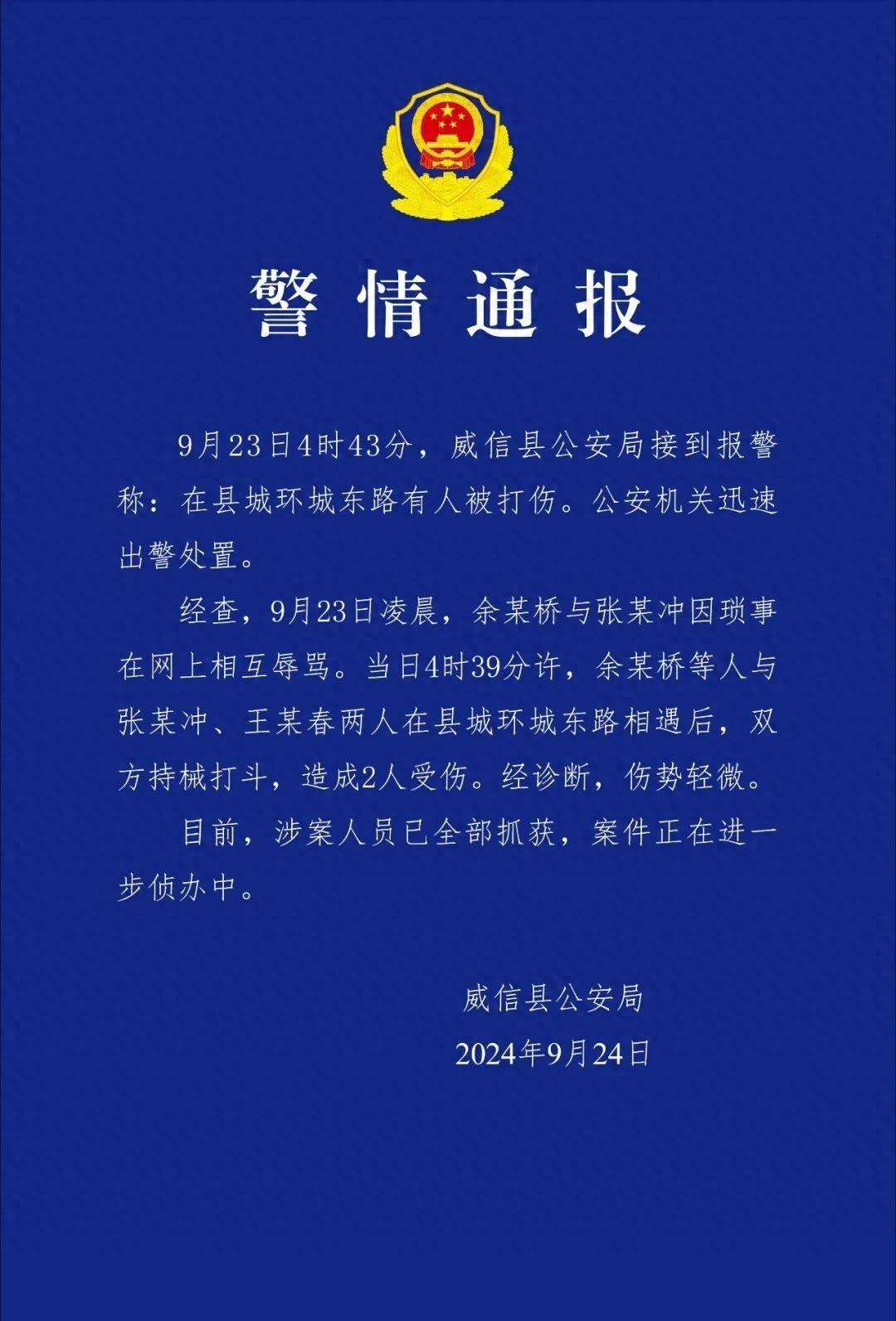 官方通报:2人轻微伤,全部被抓