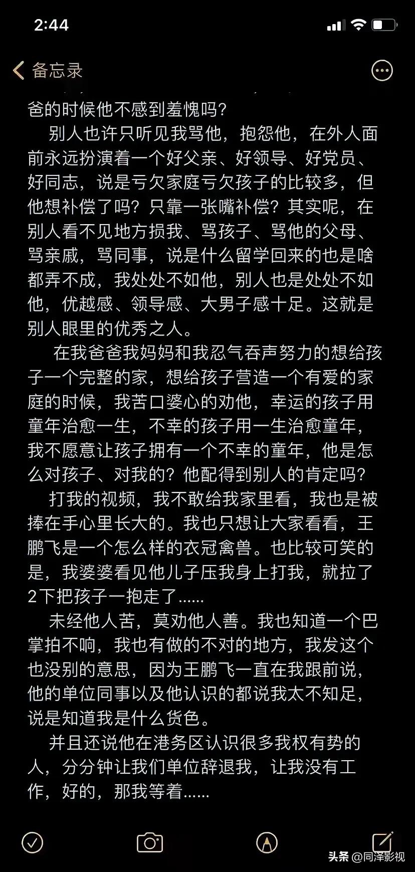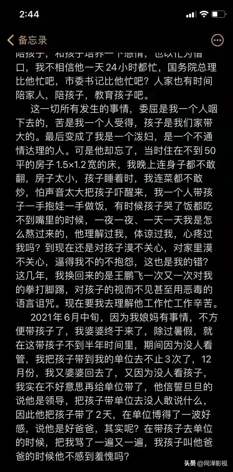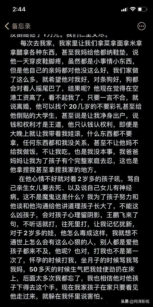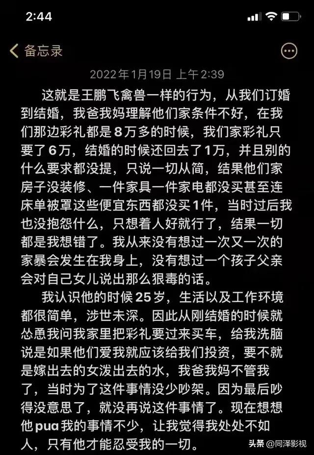 近日,陕西某公司高管王某飞家暴妻子的监控视频引发全网震怒。视频中,男子当着幼子的面疯狂殴打妻子,甚至将她的头往墙上撞击,而一旁的孩子哭喊着试图阻止,这一幕刺痛了无数人的心。(文章末尾附妻子的备忘录)