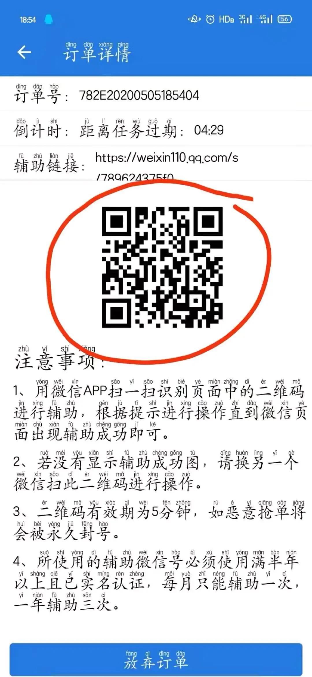 1:接到订单精力在三分钟内完成,若意识到无人帮忙扫码,请点击放弃订单,接单60s内可放弃。