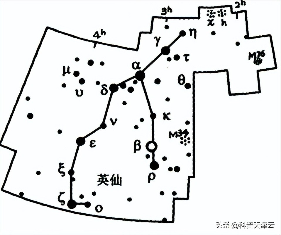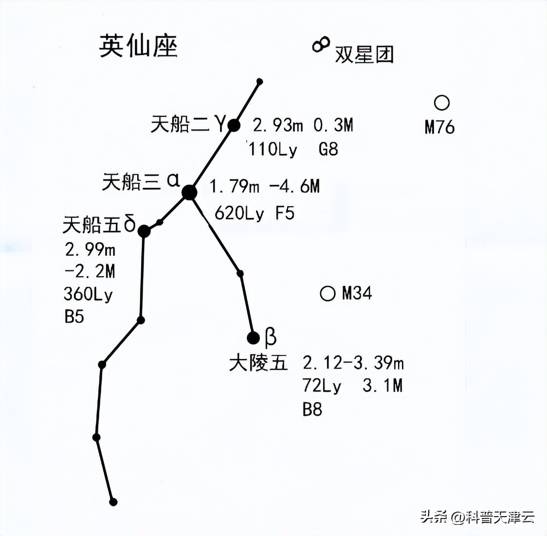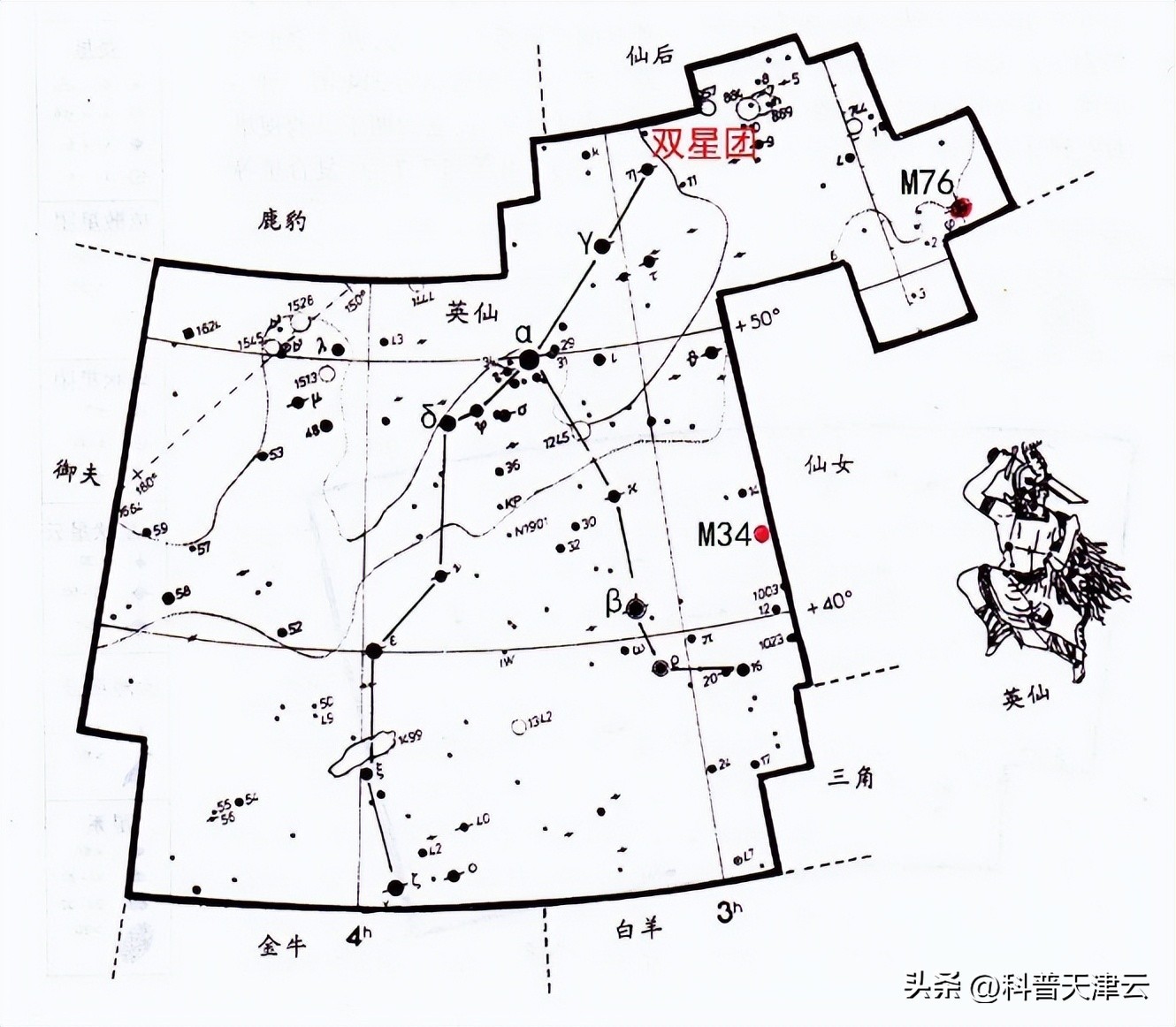在这个星座的西北边,是英仙座有名的双重星团,两个星团h(NGC869)和x(NGC884)都是疏散星团,它们之间相距30′。此外,还有两个有名的M天体,M34是一个由60颗恒星组成的疏散星团,距离我们约为1400光年,视星等为5.2等,角直径为35′;M76是1780年法国天文学家梅西耶最先发现的一个行星状星云,视星等约为12.2等,是一个有不规则圆面和有反常形状的行星状星云,中心有一颗17等的核星。