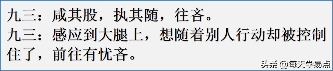 【启示】九三爻位于下体之上,象征大腿的位置。在咸卦中,九三爻是居于阳位的刚爻,代表着性格躁动和喜欢行动。九三爻必须随从初六和六二的动作,无法独自安居,而是前往与上六爻亲近。