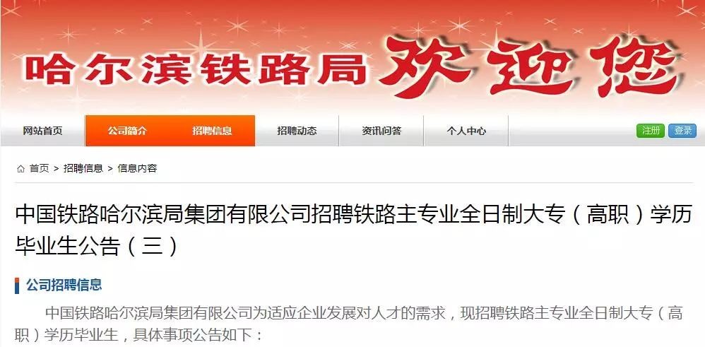 2018中国铁路哈尔滨局集团招聘铁路主专业大专毕业生公告