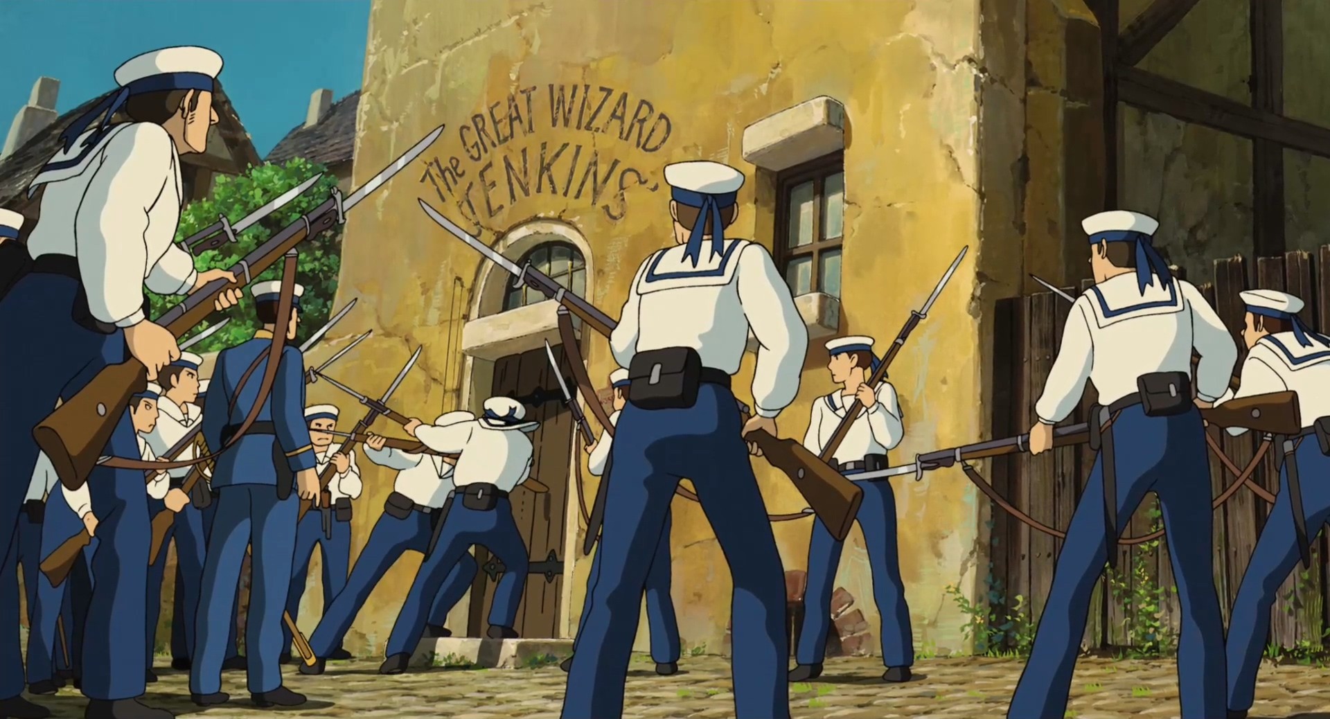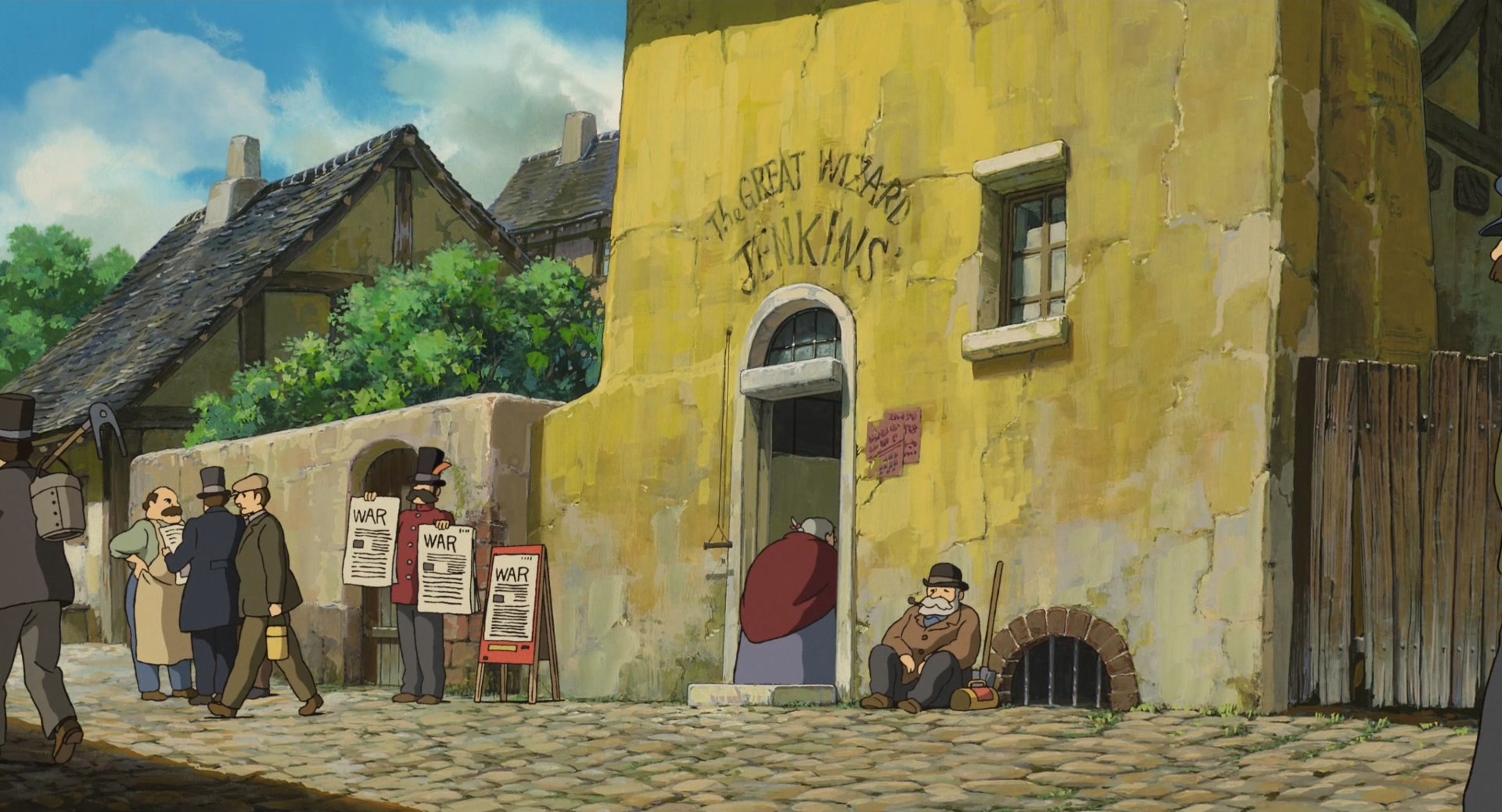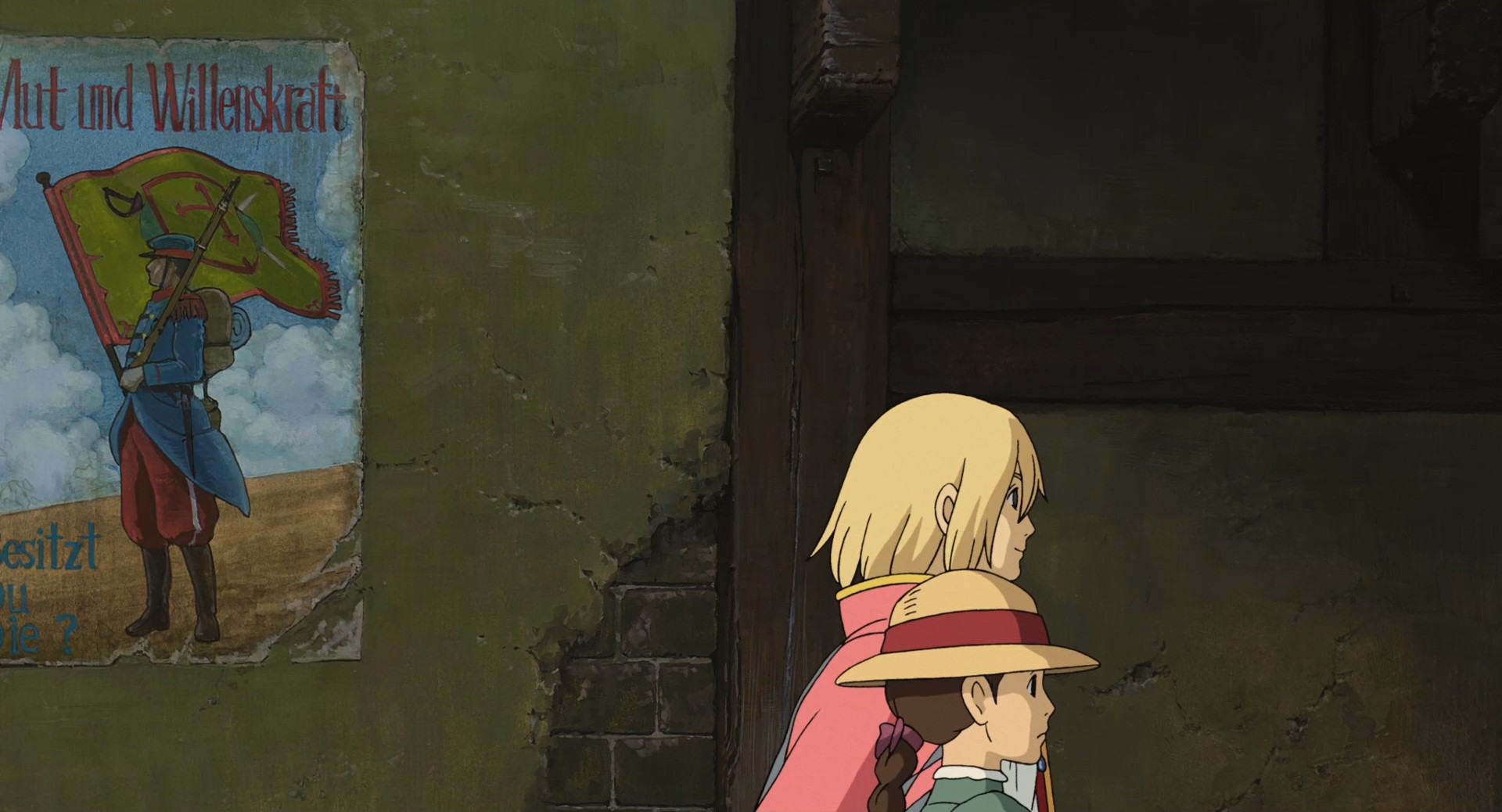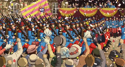 动画中哈尔和苏菲所在的金柏丽王国正在和邻国进行战争,动画中可以看到街道上张贴的战争海报和征兵告示,空中飞过的飞机也在进行战争宣传。