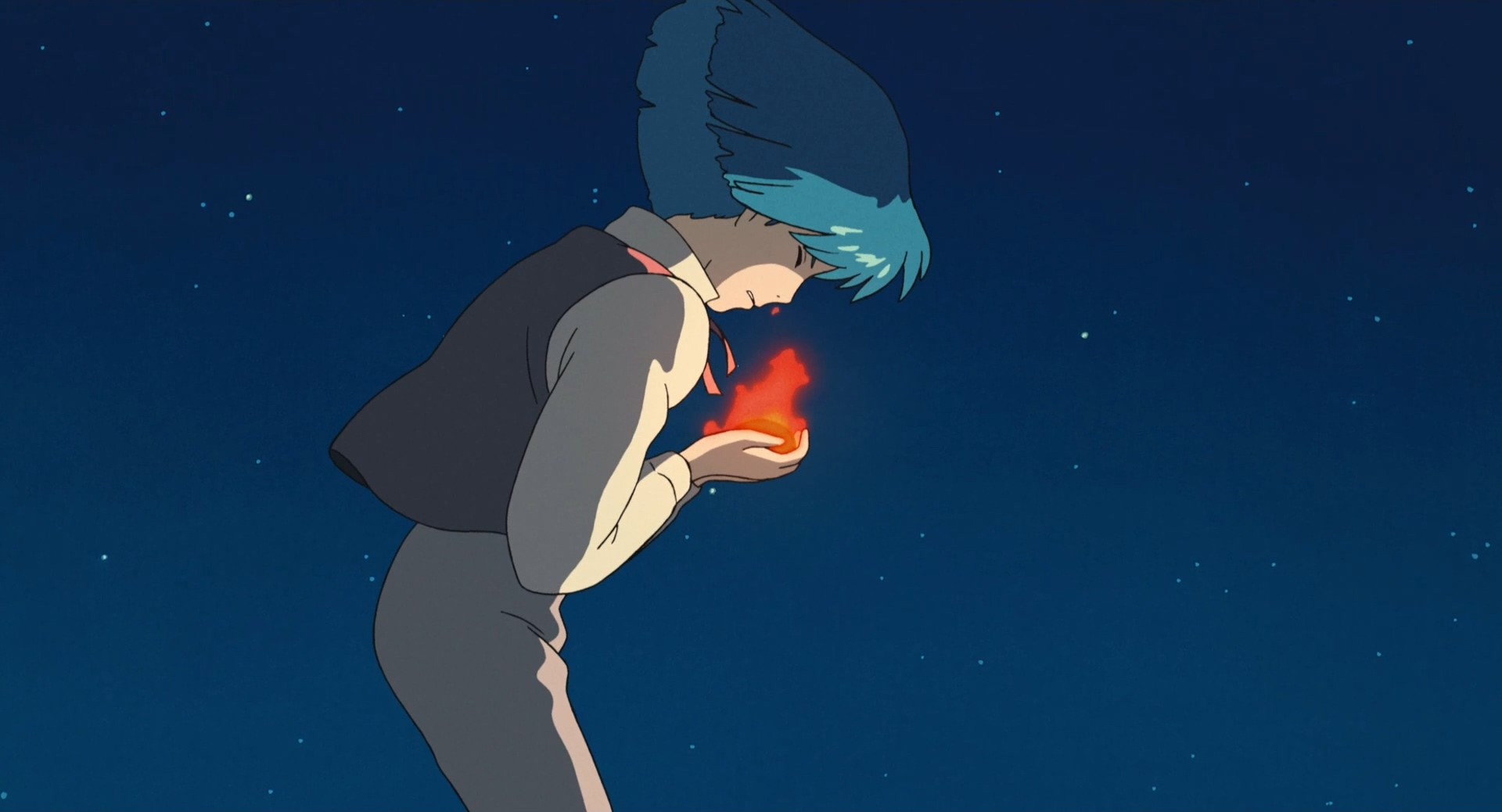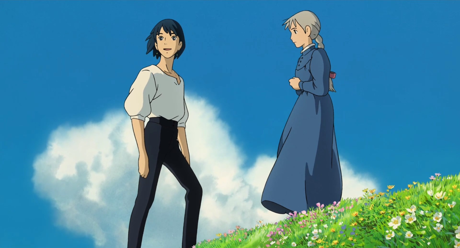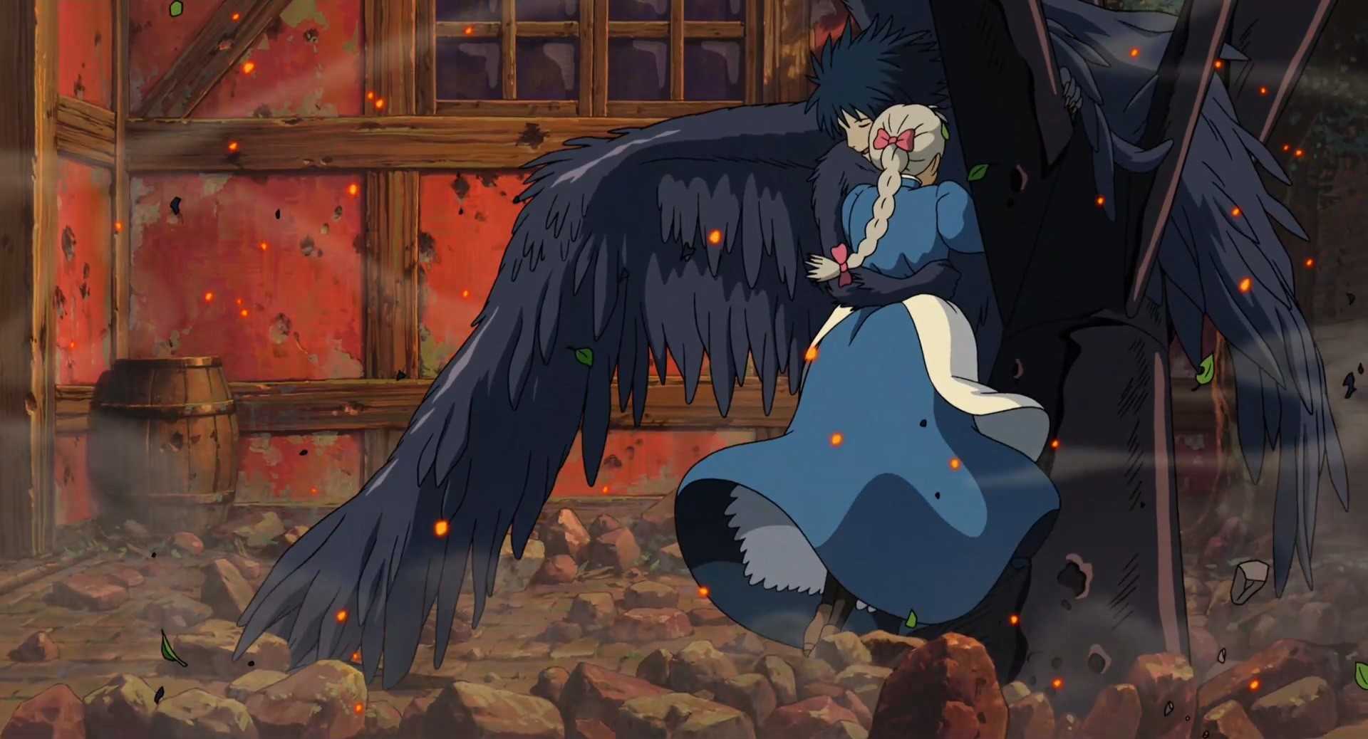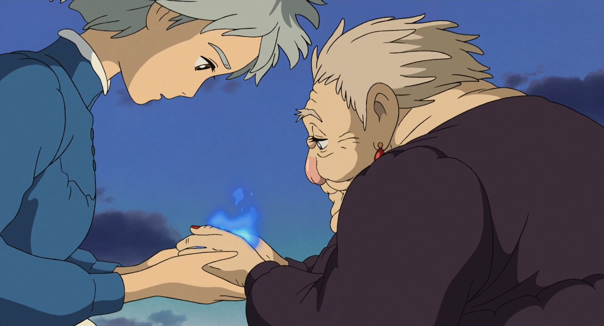 直到她亲眼目睹了哈尔为了让自己避免被炸弹命中,抱着炸弹减速差点命丧当场。以及这部动画里关于爱情最感人的那句“这些年我已经逃够了,好不容易身边有个非守护不可的人,那就是你”。才让她彻底从内心鼓起勇气,驱除了自卑。而影片从这个地方开始,苏菲就再也没有变成老太婆的样子,预示荒野女巫给她的魔咒已经解除了。