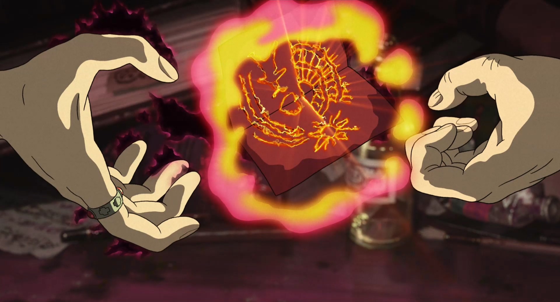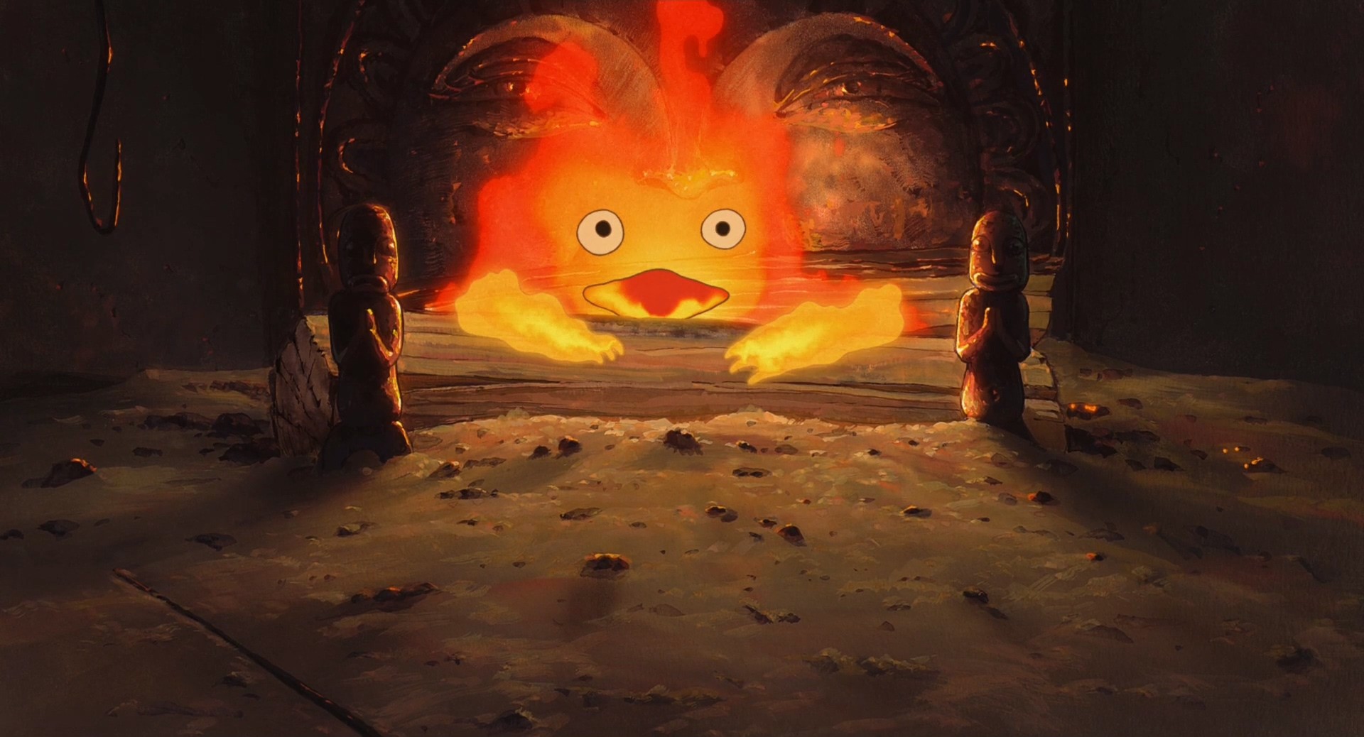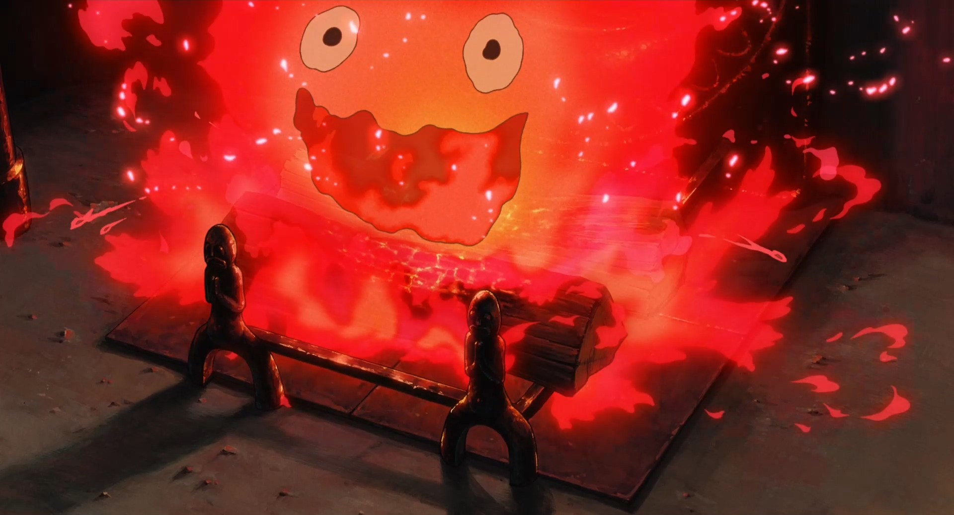 卡西法所在的炉膛有一个火架,火架上的两个小人,一个哭脸一个笑脸,这个细节很有意思。在动画结尾的时候,苏菲将卡西法按在哈尔的胸膛的时候,卡西法对她说它还一直保持哈尔小时候的样子,换言之,卡西法不但是哈尔的心脏,还是哈尔童心的写照。那么小孩子的世界有多简单呢?——高兴就笑,不高兴就哭,就是这么简单。